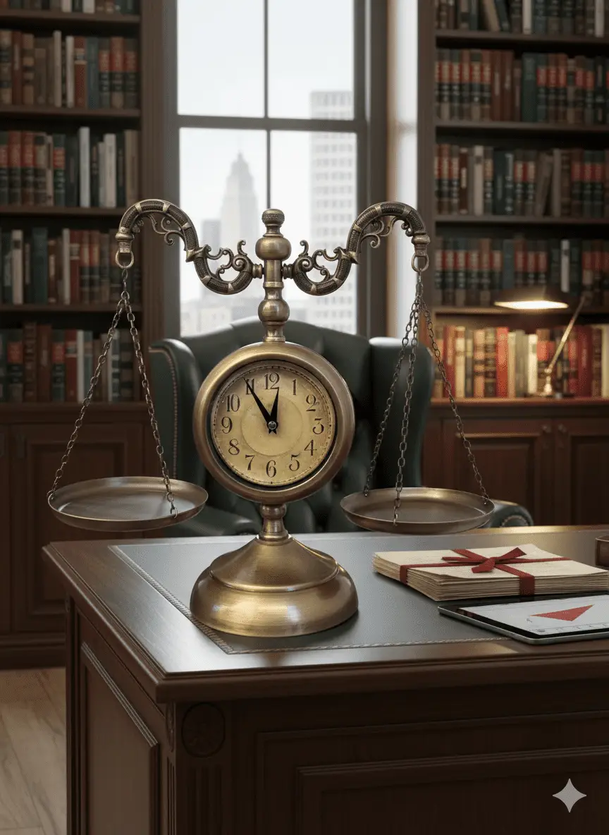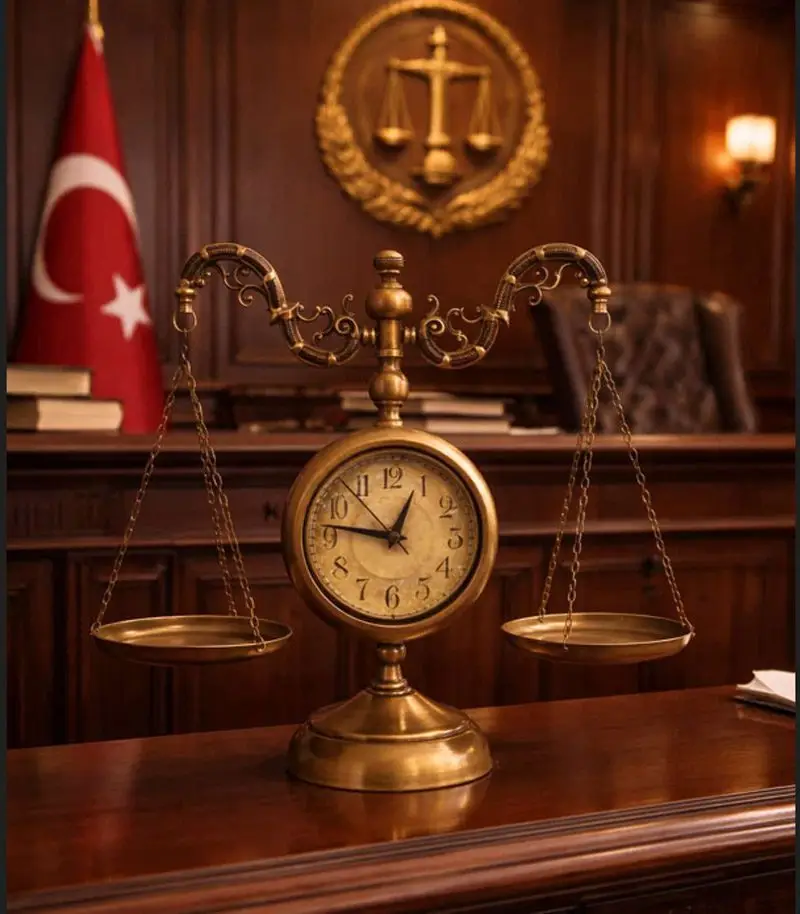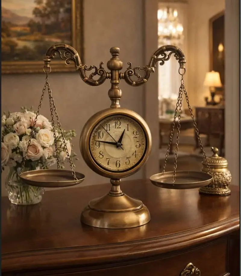 Avukatlar için tasarlanan adalet terazili metal masa saati, prestijli görünümü ve sessiz mekanizmasıyla ofis dekorunu tamamlar