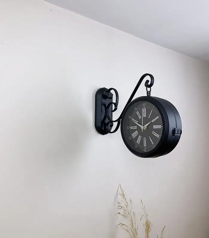 Klasik istasyon saatlerinin zamansız şıklığını modern mekanlara taşıyan Çift Taraflı Siyah İstasyon Duvar Saati, hem dekoratif hem de işlevsel bir tasarıma sahiptir. İki yüzünde de saat bulunan bu özel model, farklı açılardan rahatlıkla zamanı görebilmenizi sağlar.