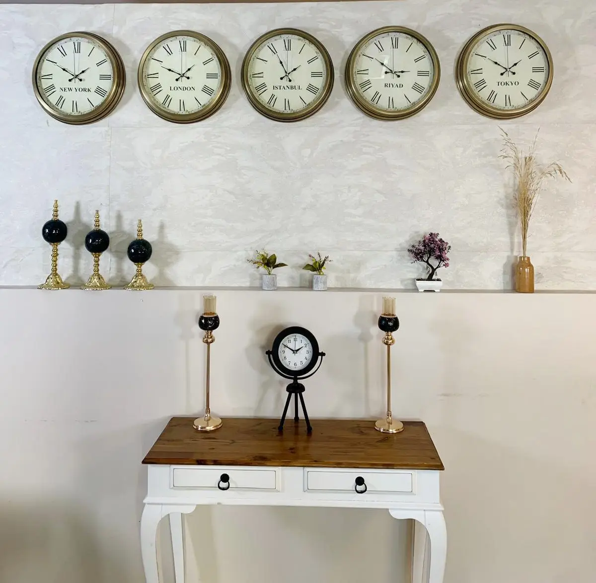Dünya Saatleri Duvar Saati 40 cm Eskitme Metal 5’li Set, sadece zamanı göstermekle kalmaz; bulunduğu mekâna prestij, karakter ve estetik bir derinlik kazandırır. Otel lobileri, ofis resepsiyonları veya global şirket merkezleri için özel olarak tasarlanmış bu set, farklı şehirlerin saatlerini şık ve düzenli bir şekilde sergilemenizi sağlar.