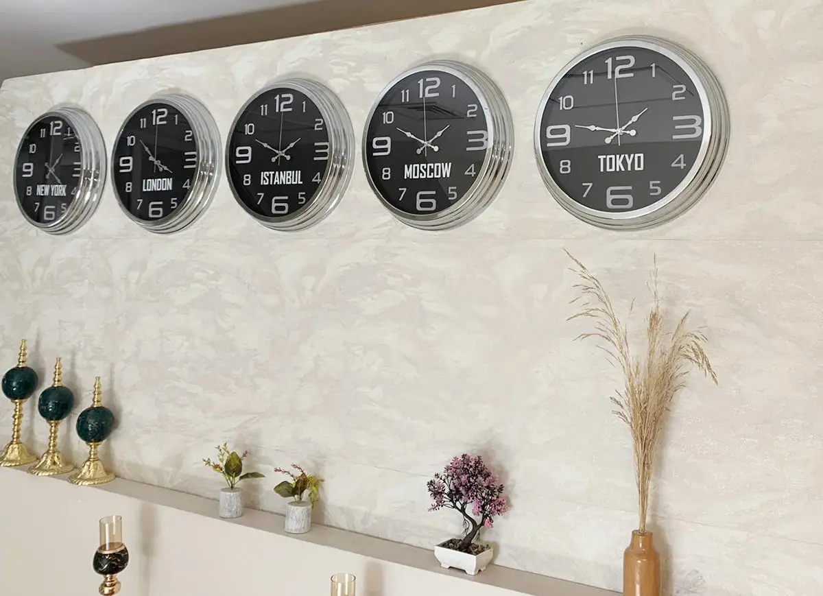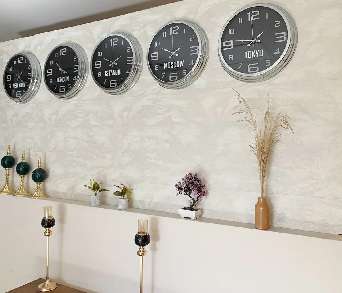 Dünya artık tek bir saatle yönetilmiyor. Bu 5’li set, farklı şehirlerin saatlerini tek bakışta görmenizi sağlar: İstanbul, Londra, New York, Tokyo ve Moskova. Her biri 40 cm çapında ve krom metal çerçeveli bu saatler, bir araya geldiğinde mekâna düzen, uyum ve prestijli bir görünüm kazandırır.