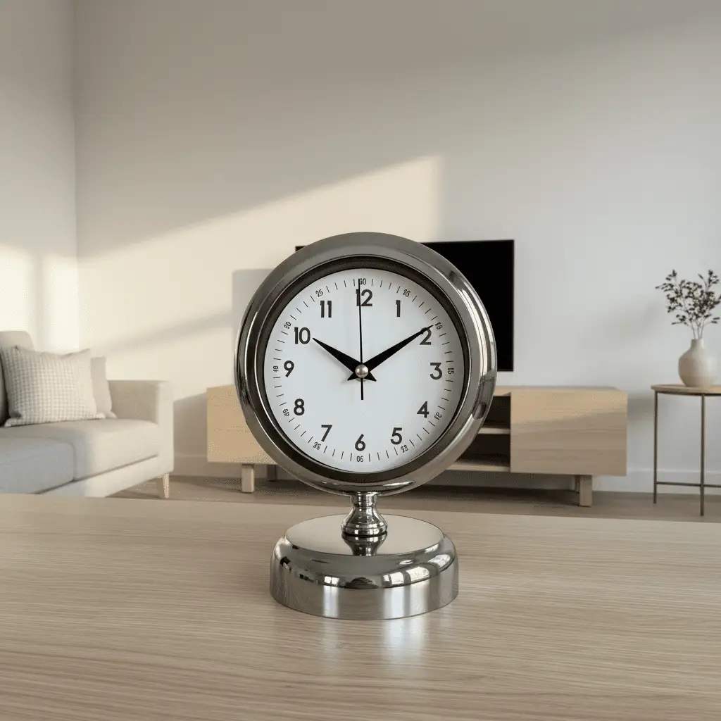 Masanıza modern bir dokunuş! Krom kaplama, gerçek cam ve sessiz mekanizmasıyla bu butik saat, şıklığı ve işlevselliği birleştiriyor. Hemen satın alın!