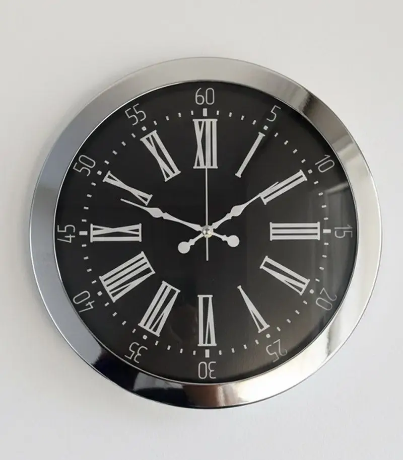 Zamansız şıklığı evinize taşıyın! Modern tasarımlı krom duvar saatiyle duvarlarınızda ışıltı ve zarafet yaratın.
