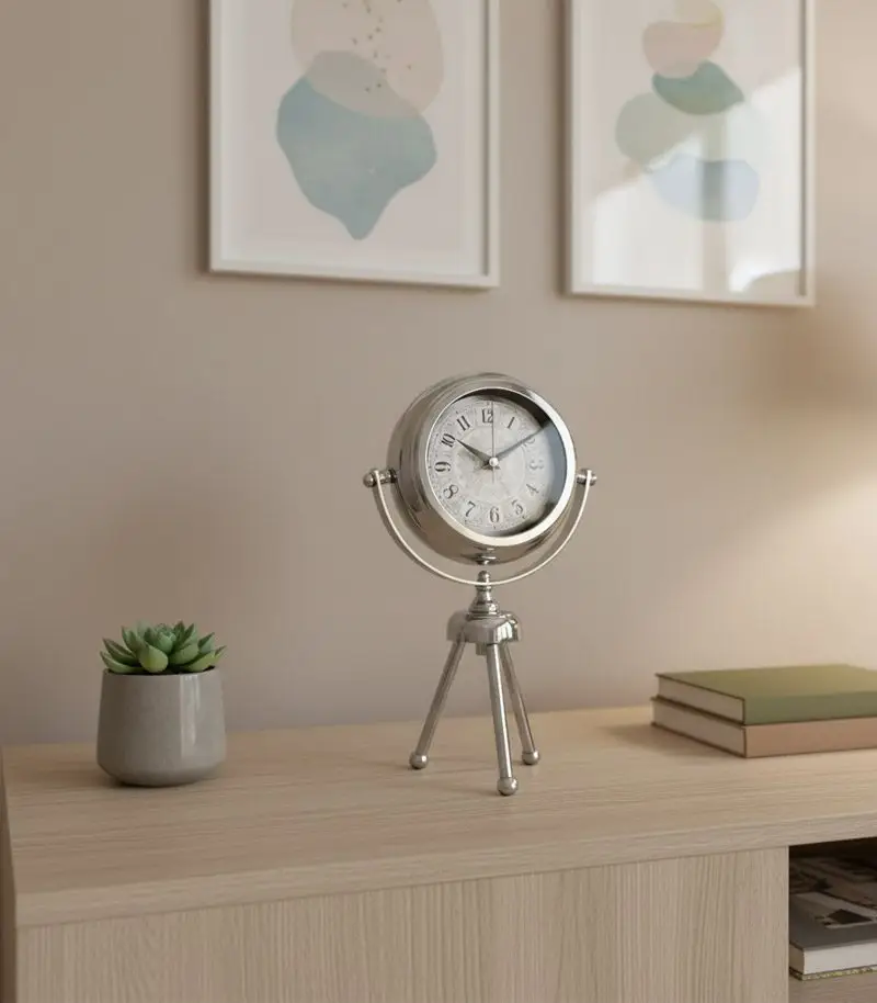 Zarif tripod tasarımı, parlak krom yüzeyi ve sessiz mekanizmasıyla Mini Tripod Dekoratif Krom Masa Saati, modern yaşam alanlarında estetik ve işlevselliği bir araya getirir.