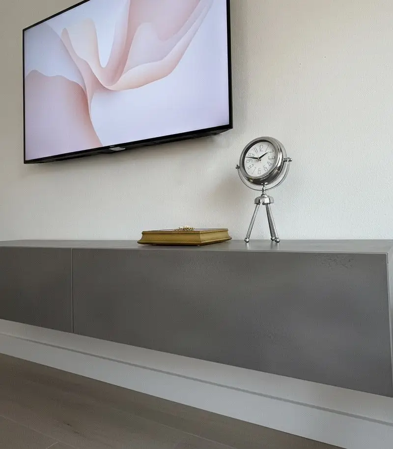 Televizyon ünitesi, kitaplık veya çalışma masası üzerinde konumlandırabilirsiniz. Krom yüzeyi, ortamın ışığıyla etkileşime girerek zarif yansımalar oluşturur ve saati odanın öne çıkan bir dekoratif unsuru hâline getirir.