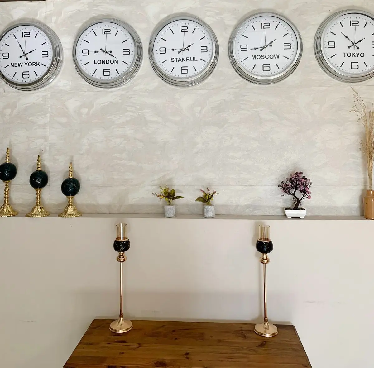 Ama Ülke Saatleri Duvar Saati 40 cm Krom Metal 5’li Setiile dünyanın her köşesindeki zamanı tek bir duvardabuluşturabilirsiniz.
