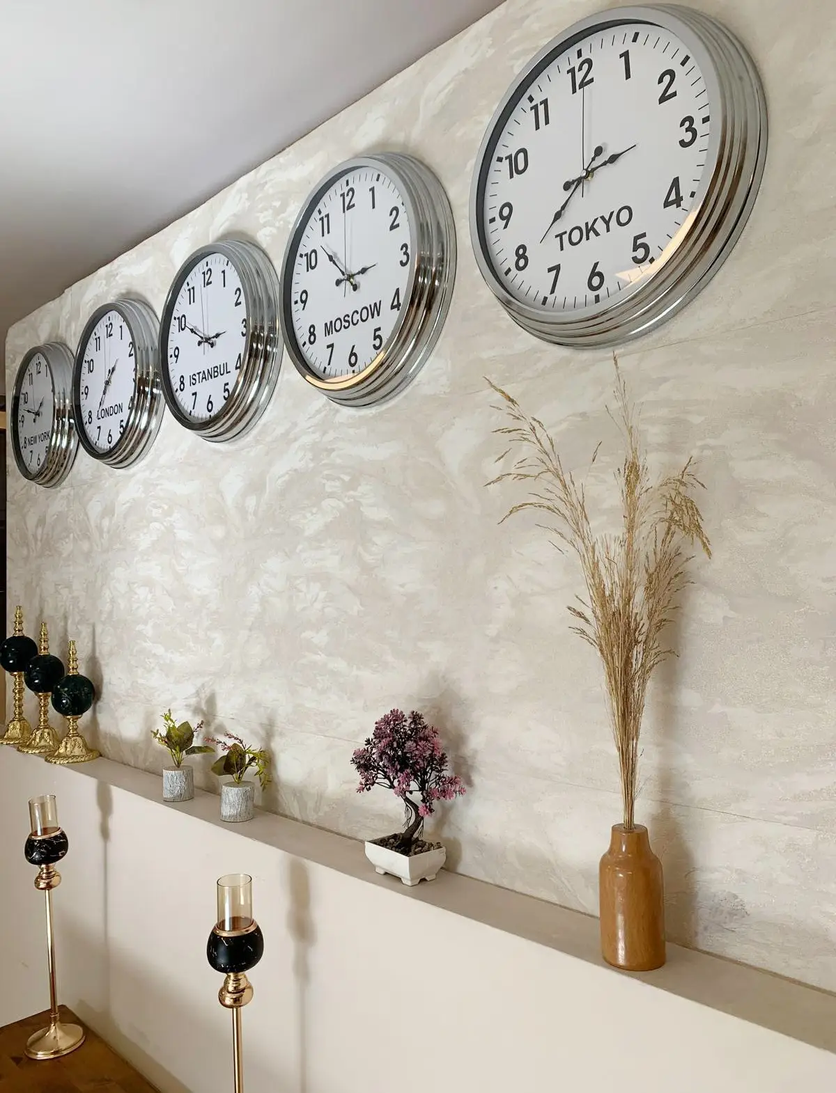 Beş farklı ülkenin saat dilimini aynı anda gösterebilen bu özel set, hem dekoratif hem işlevsel bir parçadır.